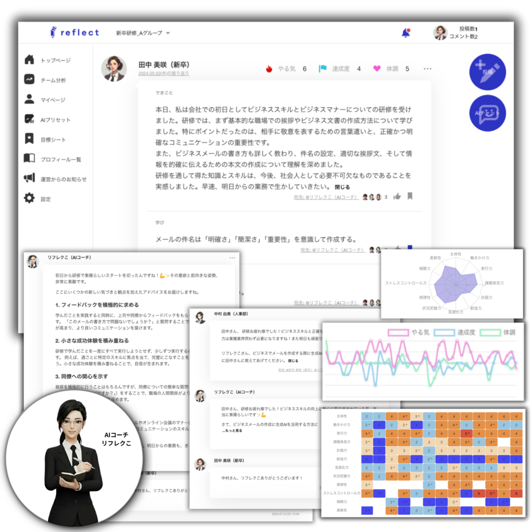 日報・週報などの振り返りを入力すると、AIコーチが即時にコメントやフィードバックを行います。伴走者は、投稿状況やコンディション、AIによる評価をリアルタイムで把握でき、育成の「見える化」と負荷軽減を同時に実現します。