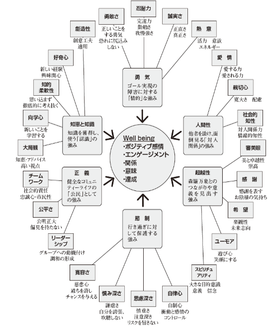 キャラクター・ストレングスとは、文化や国を超えて人々に共通する人としての強みです。様々な文化や宗教、哲学において共通して尊重される「人間の善さ」や「美徳」に根ざしたポジティブな特性であり、思考・感情・行動に安定して現れる性質のことです。仕事や生活の中で、何かをしてうまくいったと思うときに使われていたり、自分の価値観のベースになる強みです。